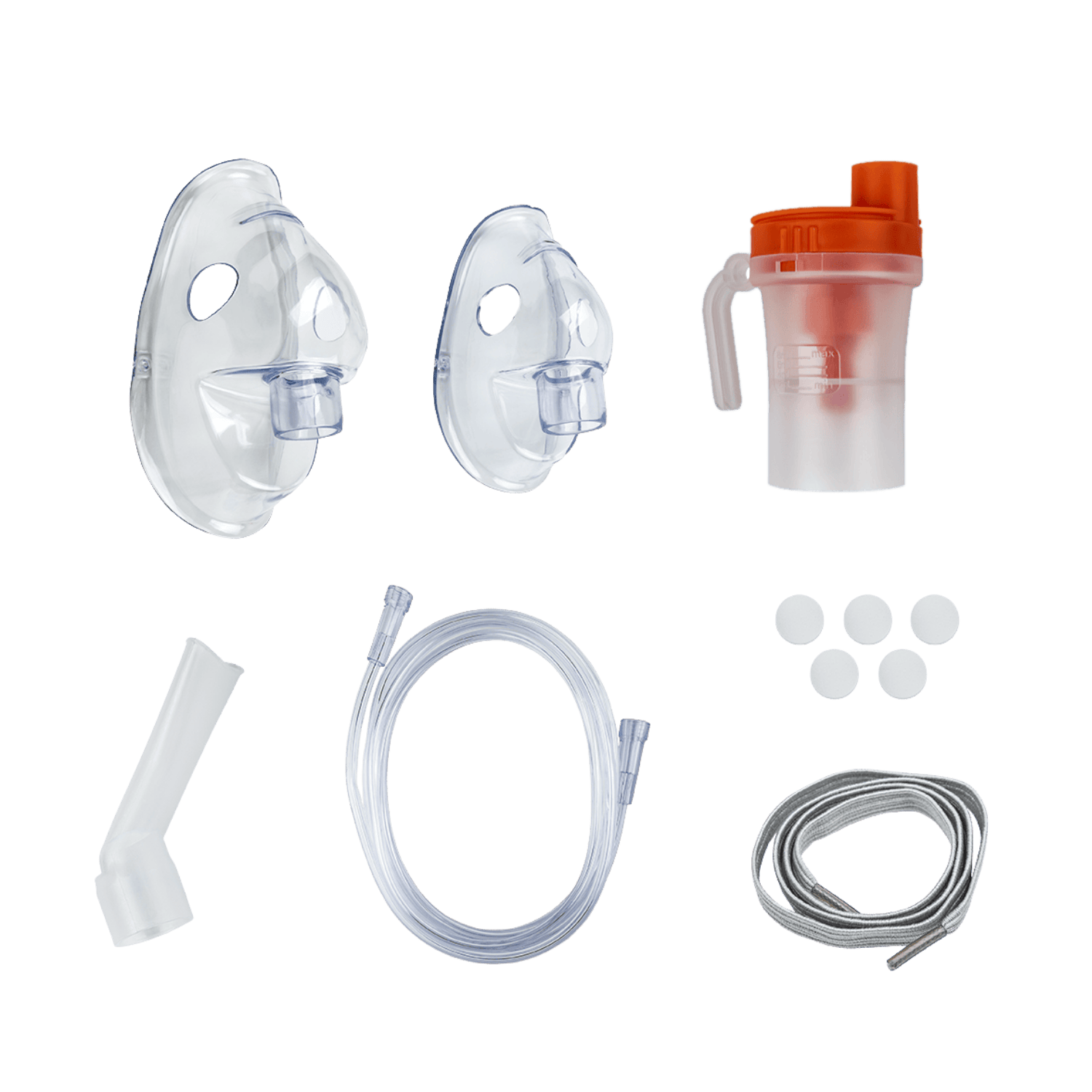 Przewód powietrzny, maska dla dorosłych, maska dla dzieci, ustnik, pojemnik na lek (nebulizator), filtry (5), gumka do maski