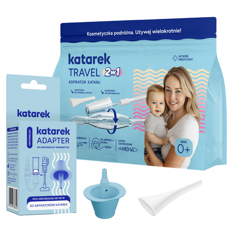 Aspirator Katarek Travel 2w1 z Adapterem Katarek do odkurzaczy pionowych. To idealne rozwiązanie na święta dla każdej mamy dziecka z katarem. Dzięki temu zestawowi możesz odciągnąć dziecku katar niezależnie od tego jaki, lub czy w ogóle masz pod ręką odkurzacz.